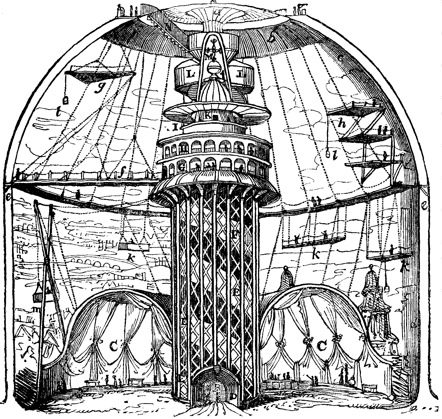 N. Stairs leading to the outside of the Building. a. b. Sky-lights. c. Plaster Dome, on which the sky is painted, d. Canvass on which the part of the picture up to the horizon is painted. e. Gallery, suspended by ropes, used for painting the distance, and uniting the plaster and the canvas. f. Temporary Bridge from the Gallery G to the Gallery e. from the end of which the echo of the building might be heard to the greatest advantage. g. One of Fifteen Triangular Platforms, used for painting the sky. h. Platforms fixed on the ropes of the Gallery e, used for finishing and clouding the sky. k. Different methods for getting at the lower parts of the canvas. l. Baskets for conveying colours. &c. to the artists, m. Cross or Shears, formed of two poles, from which a cradle or box is suspended, for finishing the picture after the removal of all the scaffolding and ropes.