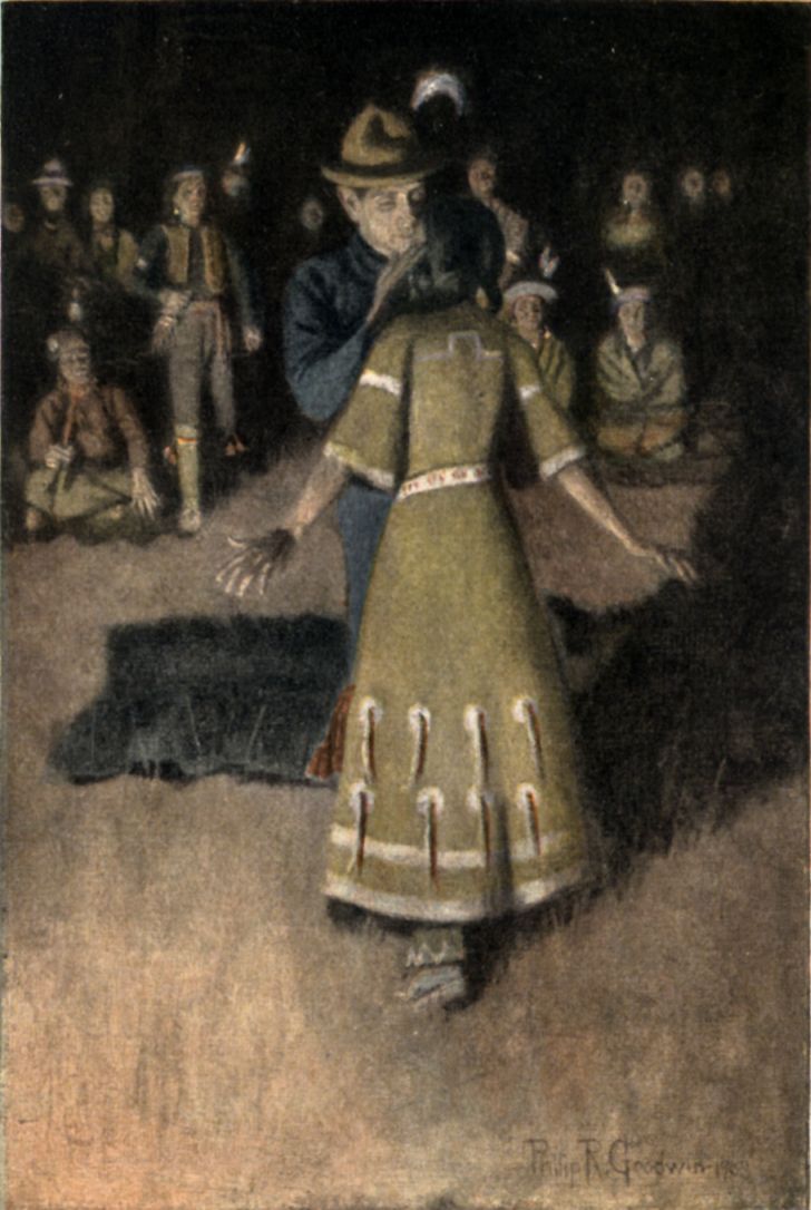 Suddenly out of the dimness loomed the tall form of an Indian, advancing with long, straight strides. In a moment he was among them responding composedly to their greetings.