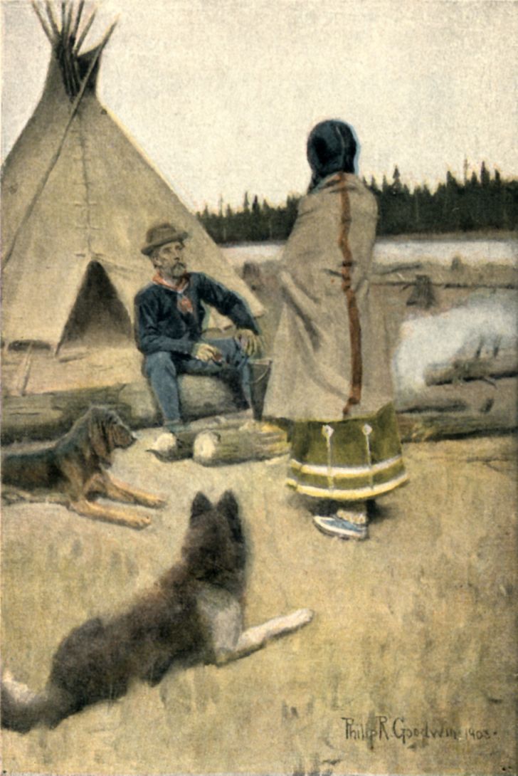 The men were busy with soft-voiced talk, punctuating their remarks with low laughter of a singularly infectious character. It was strange speech, richly embroidered with the musical names of places, with unfamiliar names of beasts, and with unintelligible names of things. Kenógami, Mamátawan, Wenebógan, Kapúskasíng, the silver-fox, the sea-otter, the sable, the wolverine, the musk-ox, parka, babiche, tump-line, giddés,—these and others sang like arrows cleaving the atmosphere of commoner words. In the distant woods the white-throats and olive thrushes called in a language hardly less intelligible.