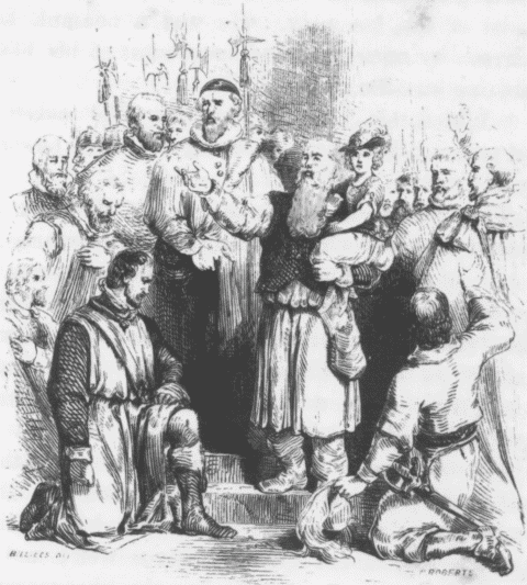 "And now, fellow soldiers, you see this old banner of England. Some of you, I doubt not, may think it treason for a man to lay violent hands upon it. But whether or no it be treason to man, I have good assurance in my conscience that it is no treason to God. Wherefore I have resolved that we will rather be God's soldiers, than soldiers of the Pope of Rome; and in that mind I now cut the Papal Cross out of this banner."