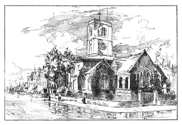 Lawrence or Monmouth House stood on the north side of Lordship Yard. Here Dr. Smollett once lived and wrote many of his works; one of the scenes of “Humphrey Clinker” is actually laid in Monmouth House. The old parish church stands at the corner of Church Street. The exterior is very quaint, with the ancient brick turned almost purple by age; and the monuments on the walls are exposed to all the winds that sweep up the river. The square tower was formerly surmounted by a cupola, which was taken down in 1808 because it had become unsafe. The different parts of the church have been built and rebuilt at different dates, which makes it difficult to give an idea of its age. Faulkner says: “The upper chancel appears to have been rebuilt in the fifteenth century; the chapel of the Lawrence family at the end of the north aisle appears to have been built early in the fourteenth century, if we may judge from the form of the Gothic windows, now nearly stopped up. The chapel at the west end of the south aisle was built by Sir T. More about the year 1522, soon after he came to reside in Chelsea. The tower was built between the years 1667 and 1679.”