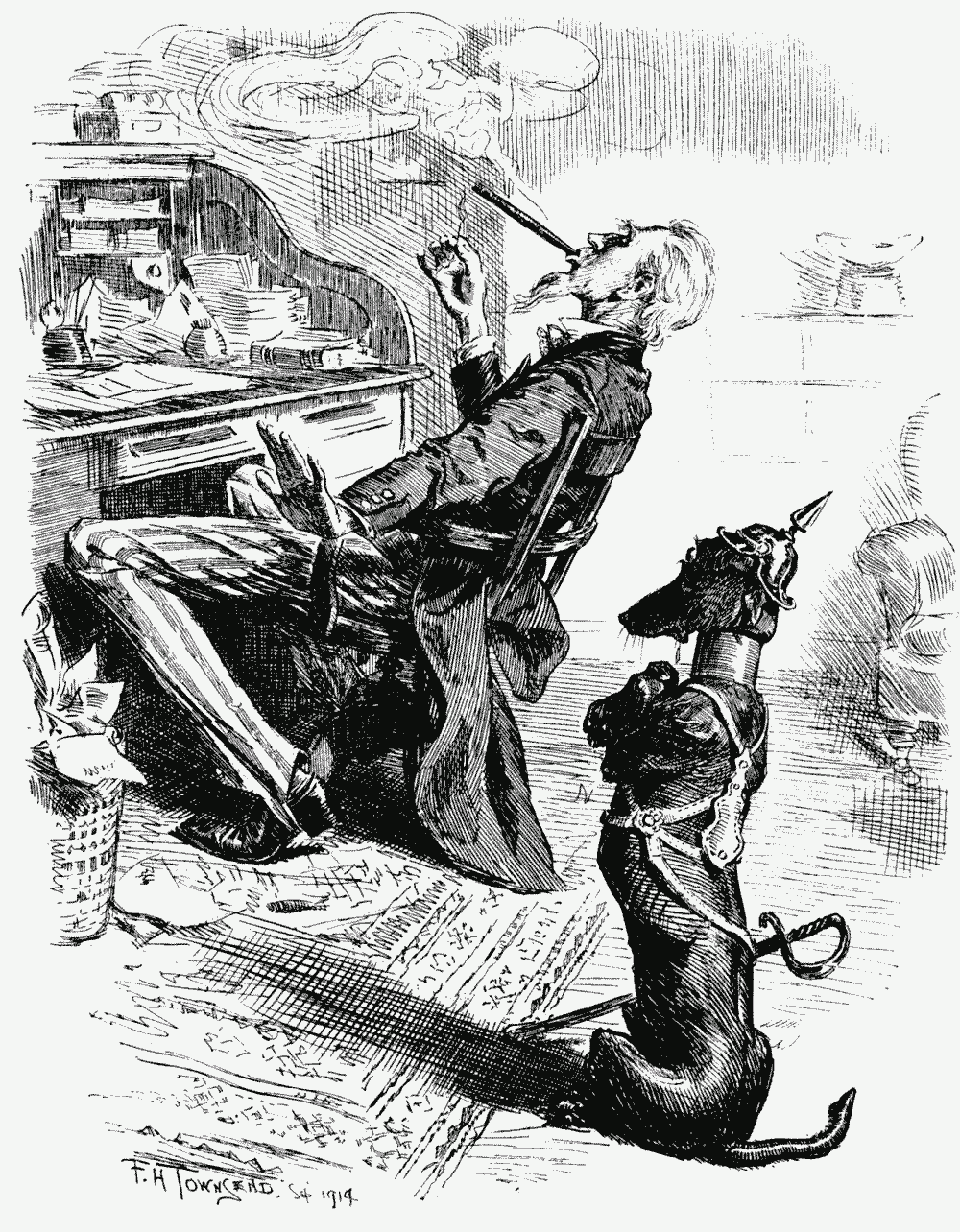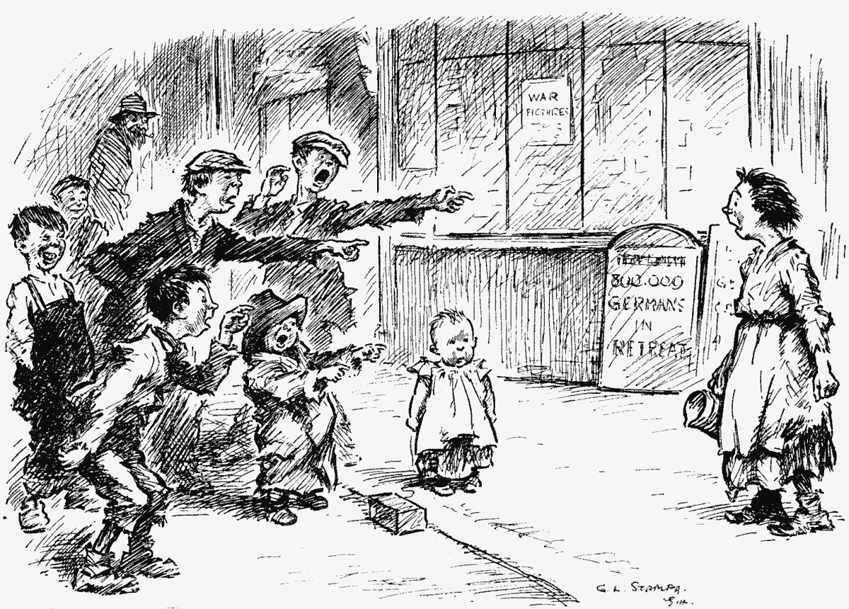 Chorus. "Boo! 'oo kissed 'er 'and to the Kaiser larst time 'e come over? Yar! Bloomin' German!"
