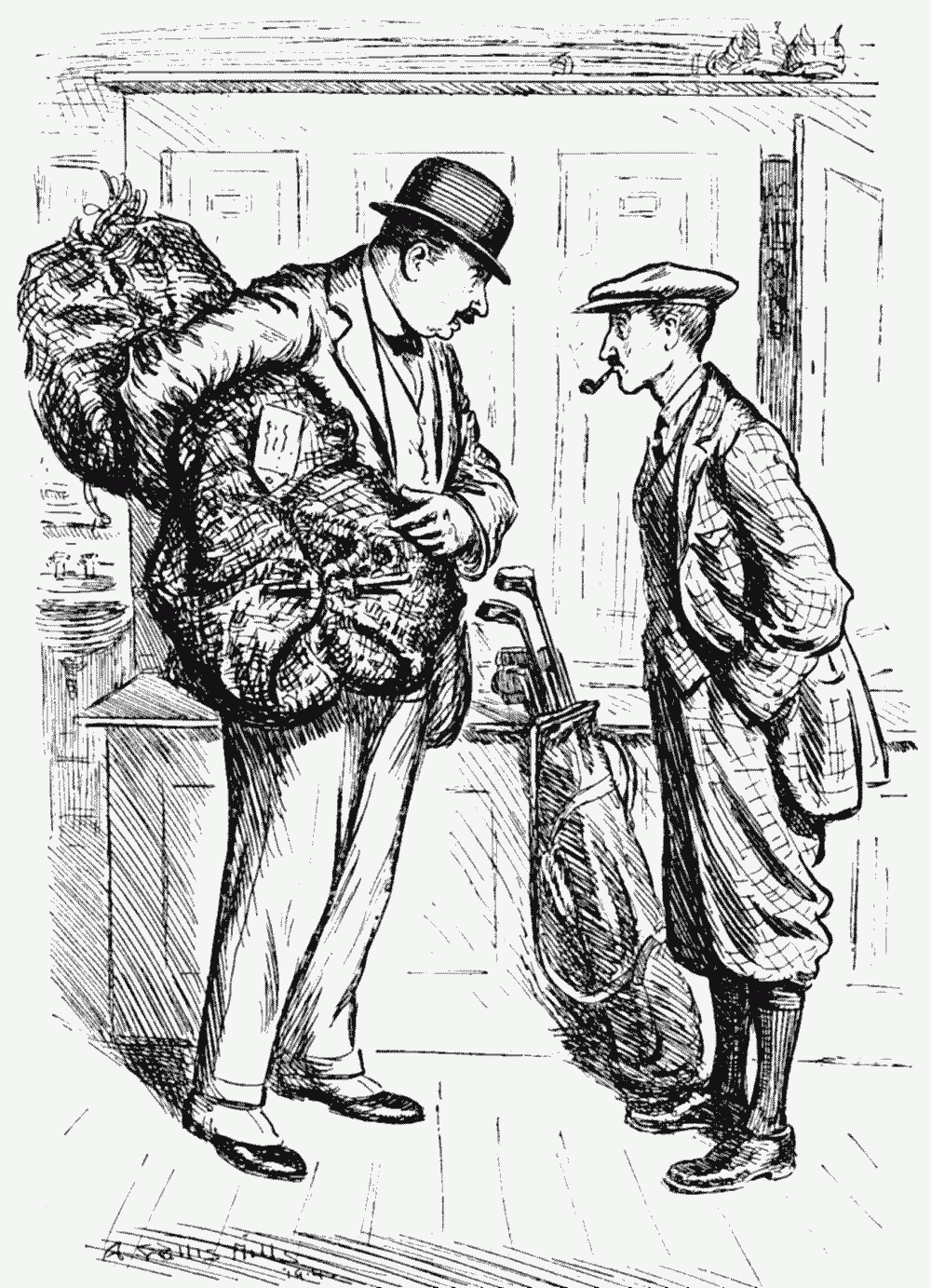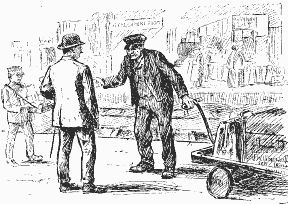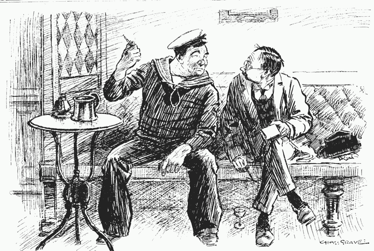 Another item reaches us from the dear old village of Pufflecombe this week. The oldest inhabitant met a stranger. "'Scuse me, Zur," he said, "but be you from Lunnon town?" The visitor nodded. "Then maybe, Zur," said the rustic, "you can tell me if it be true, as I have heerd tell, that relations 'tween England and Germany be strained?"