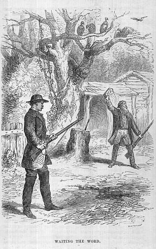 He has “treed” the squirrel; but what of that? The nimble creature, having swooped up to a high limb, seats itself there, and looks down upon its impotent pursuer with a nonchalant defiance—at intervals more emphatically expressing the sentiment by a saucy jerk of its tail. But this false security proves the squirrel’s ruin. Deceived by it, the silly animal makes no effort to conceal its body behind the branch; but, sitting upright in a fork, presents a fair mark to the rifle. The girl raises the piece to her shoulder, takes aim, and fires.