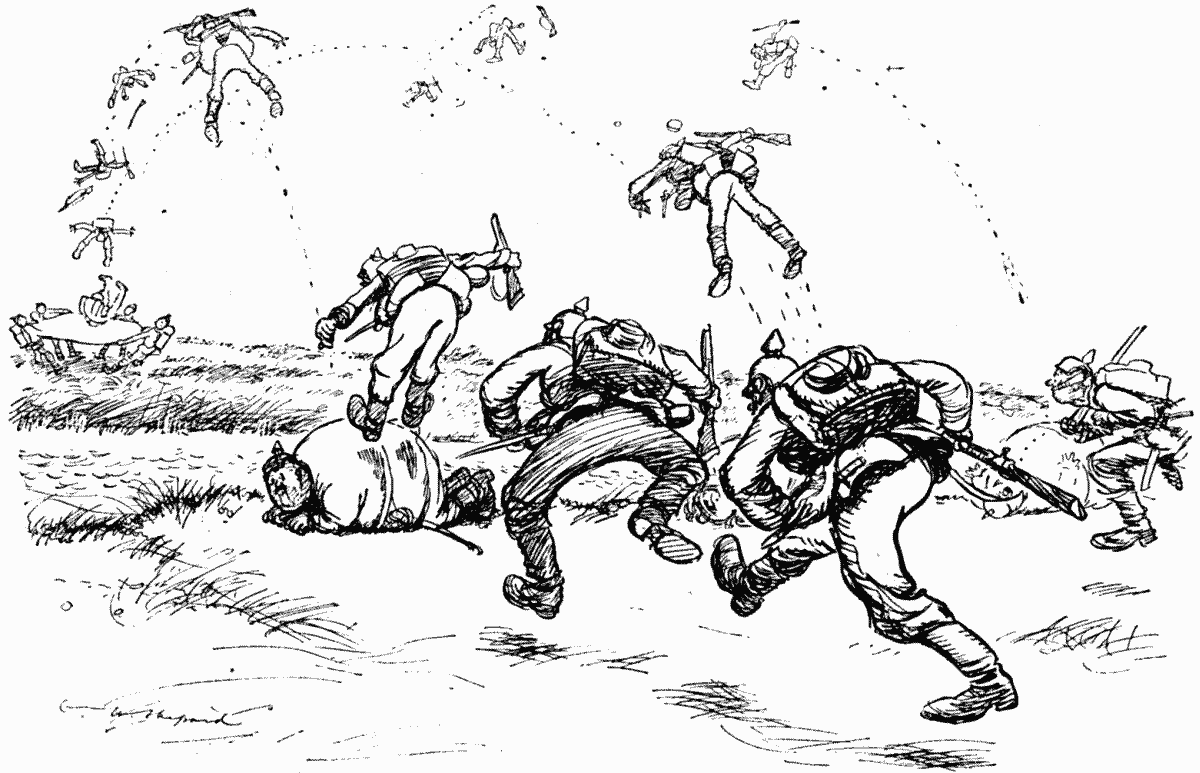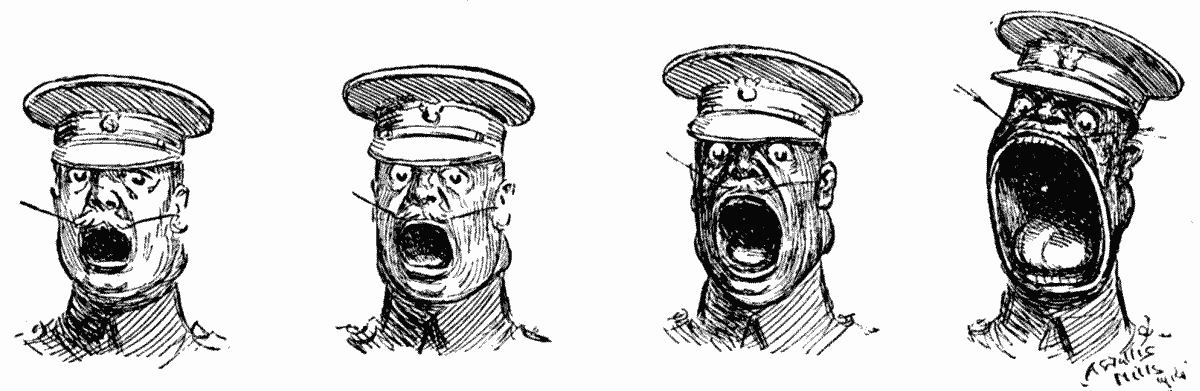 A detachment of British cavalry, while playing water polo in the Oise, suddenly spotted a patrol of German Uhlans, jumped on their horses naked, and in that state charged the enemy. We understand that a protest has been lodged at the War Office by the British Propriety League.
