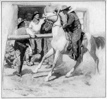 "The first time we-all ever sees Dead Shot, he comes trackin' into the Red Light one evenin' jest after the stage rolls up. Bein' it's encroachin' on second drink time, he sidles up to the bar; an' then, his manner some diffident an' apol'getic, he says: