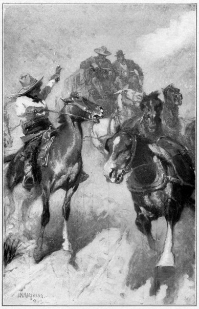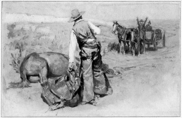 | Turkey Track, seein' he's afoot an' thirty miles from his home ranch pulls his gun an' sticks up the mockin' bird's buckboard. | 138 |