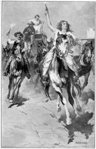 WE MAKES FOUR TRIPS BACK AND FORTH BETWEEN WOLFVILLE AND RED DOG, CRACKIN' OFF OUR GOOD OLD '45'S AT IRREG'LAR INTERVALS, FARO NELL ON HER CALICO PONY AS THE GODDESS OF LIBERTY, BUSTIN' AWAY WITH THE REST. Frontispiece. p. 170.
