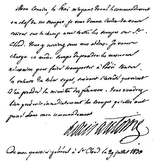 Mon cousin, le Roi m'ayant donné le commandement en chef de ses troupes, je vous donne l'ordre de vous retirer sur le champ avec toutes les troupes sur St. Cloud. Vous y servirez sous mes ordres. Je vous charge en même temps de prendre les mesures nécessaires pour faire transporter à Paris toutes les valeurs du trésor royal, suivant l'arrêté que vient d'en prendre le ministre des finances. Vous voudrez bien prévenir immédiatement les troupes qu'elles ont passé dans mon commandement.