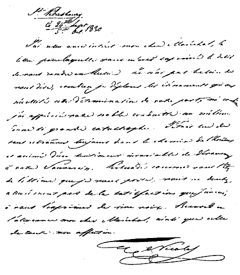 J'ai reçu avec intérêt mon cher Maréchal, la lettre pour laquelle vous m'avez exprimé le désir de vous rendre en Russie. Je n'ai pas besoin de vous dire, combien je déplore les événements qui ont nécessité cette détermination de votre part, ni combien j'ai apprécié votre noble conduite au milieu d'une si grande catastrophe. J'étais sûr de vous retrouver toujours dans le chemin de l'honneur et animé d'une sentiment invariable de dévouement à votre souverain. Persuadé comme vous l'êtes de l'estime que je vous porte, vous ne doutez assurément pas de la satisfaction que j'aurai, à vous l'exprimer de vive voix. Recevez en l'assurance mon cher Maréchal, ainsi que celle de toute mon affection.