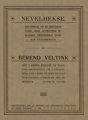 Tegen den aovend—onze knecht was nao 't dorp om deur Loeks, de smid, een koeze te laoten trekken, Margien lag met de rooze onder een bovenbedde op een onderbedde, en onze Berend was in de schoele bij 't rederiekeren um de keersen te snuten—zee Jaaije tegen mij, net toe 'k veur de tweede keer nao Willem Snikking oet praoten wol, die as dragonder te Deventer is een peerdespul hadde zeen—ie mossen te hoes blieven, want ik hebbe met oe 't een en ander te verhakstukken.