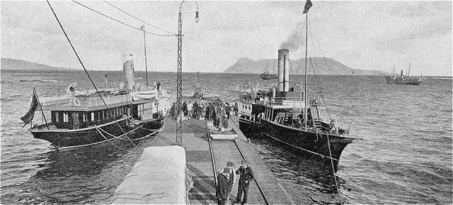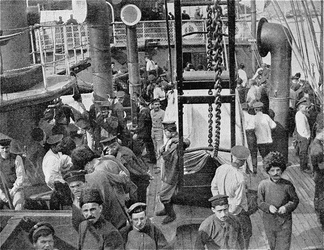 Le rapatriement des prisonniers russes internés au Japon se poursuit, non sans incidents. On n'a pas oublié sans doute les mutineries qui se sont produites à bord de quelques-uns des navires qui ramenaient à Vladivostok des marins et des soldats du tsar. Ces révoltes, qui semblaient comme une répercussion des troubles qui désolent l'empire, ont été parfois graves à ce point qu'on a vu les chefs russes obligés, pour rétablir l'ordre parmi les hommes qu'ils convoyaient, de faire appel aux baïonnettes et aux revolvers des Japonais. La photographie qu'on voit ici a été prise à bord d'un transport chargé de prisonniers, au départ de Yokohama. Les uniformes sombres des hommes de l'armée de terre s'y mêlent aux chemises blanches des matelots.