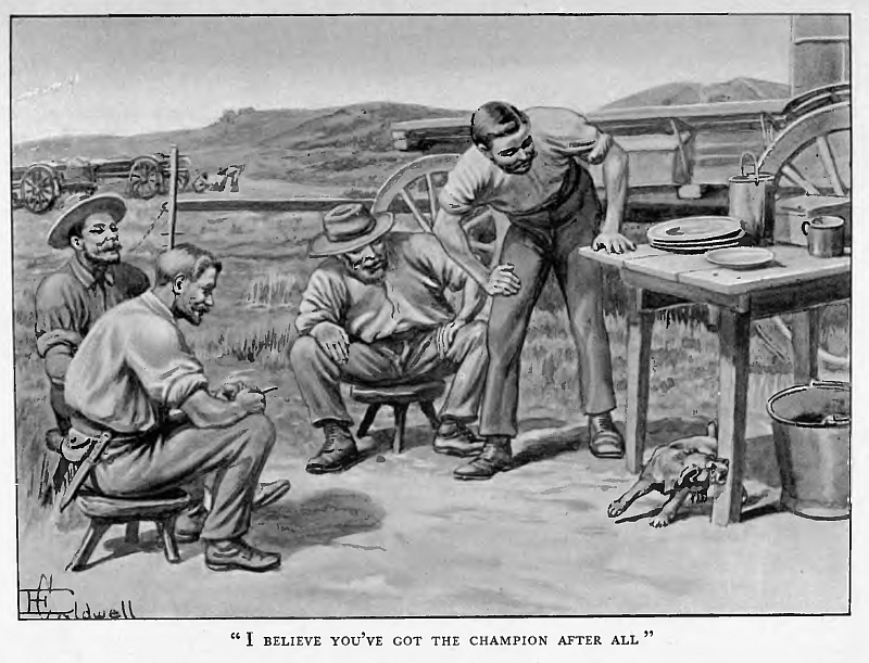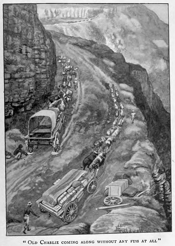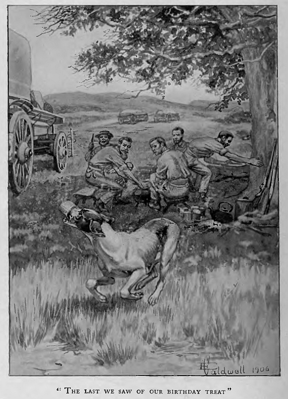 “I sent some goats,” said Bob, smiling for a moment at some passing thought, and then went on: “Tom said he had an old span that wouldn’t mind it. We loaded him up at Parker’s, and I cleared out before he got the cattle up. But they tell me there was a gay jamboree when it came to inspanning; and as soon as they got up to the other waggons and the young bullocks winded Jim, they started off with their tails up—a regular stampede, voorloopers and drivers yelling like mad, all the loose things shaking out of the waggons, and Tom nearly in a fit from running, shouting and swearing.”