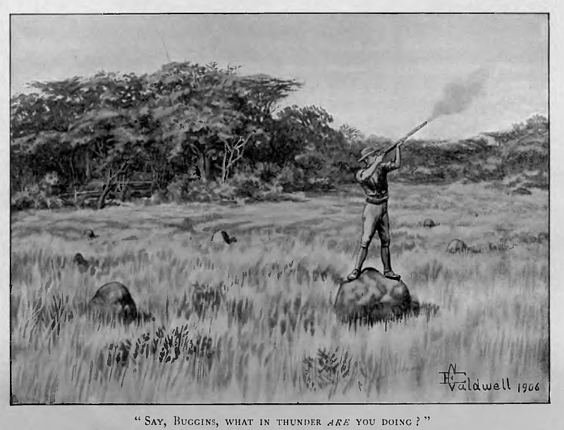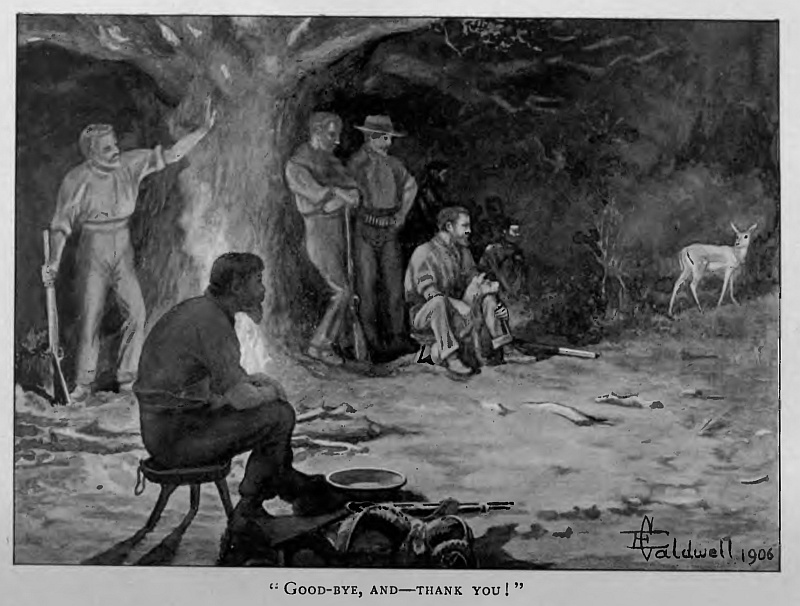 “See here, young feller!” said Wisdom, “don’t go fill yourself up with tomfool notions ’bout lions and tigers waitin’ behind every bush. You won’t see one in a twelvemonth! Most like you won’t see a buck for a week! You don’t know what to do, what to wear, how to walk, how to look, or what to look for; and you’ll make as much noise as a traction engine. This ain’t open country: it’s bush; they can see and hear, and you can’t. An’ as for big game, you won’t see any for a long while yet, so don’t go fool yourself!”