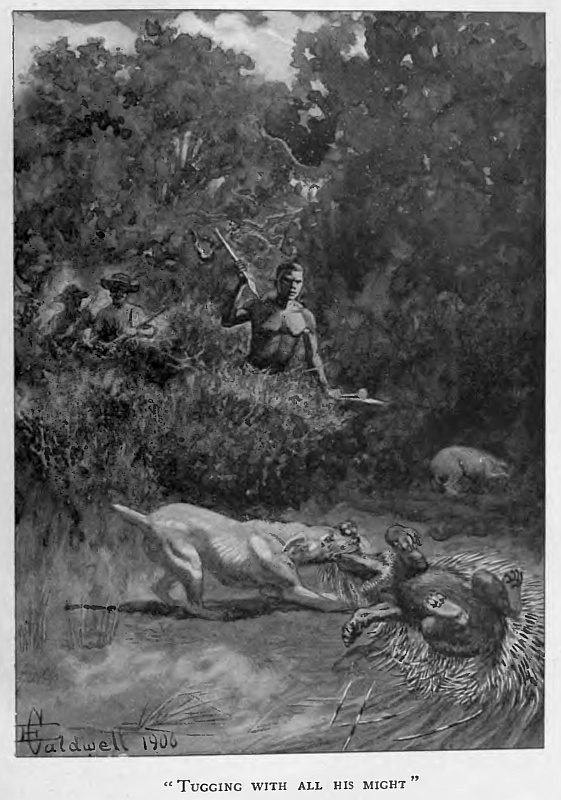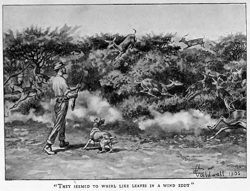 From the date of that lesson it was apparent that reputations would suffer if the story of Jock were not speedily embodied in some durable and authoritative form, and during a long spell of ill health many of the incidents were retold in the form of letters to the Little People. Other Less Important Persons—grown-ups—read them and sometimes heard them, and so it came about that the story of Jock was to be printed for private circulation, for the Little People and their friends. Then the story was read in manuscript and there came still more ambitious counsels, some urging the human story of the early days, others the wild animal life of South Africa. Conscious of many deficiencies the narrator has left two great fields practically untouched, adhering to the original idea—the story of Jock; and those who come into it, men and animals, come in because of him and the life in which he played so large a part. The attempt to adapt the original letters to the symmetry of a connected story involved, as one might have known, endless trouble and changes, necessitating complete re-writing of most parts; and the responsibility and work became still greater when, after a casual and unforeseen meeting, my friend Mr Caldwell accepted the suggestion to come out to South Africa and spend six months with us in order to study the game in its native bush and to know the conditions of the life and put that experience into the work of illustrating “Jock.”