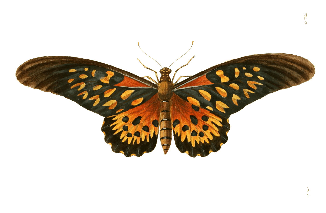 Upper Side. Antennæ brown. Head black, with eight whiteish spots on the top. Thorax black, with four white spots at the base of the anterior wings. Abdomen black at the base and at top, clay-coloured on the sides and extremity. Anterior wings black at the base, but at the extremities more of a brown colour, with eighteen different shaped marks and spots; those next the body dark orange, the others yellow clay-coloured, some being so faint as to be hardly discernible. Posterior wings slightly dentated, the inner scollops being edged with clay-coloured crescents. These wings, next the body, are of a dark orange; the remainder clay-coloured, with a broad black border running round each wing, from the upper corners to the abdominal ones; the inner sides being deeply indented, and the outer ones scolloped, with eight roundish black spots near the middle of each wing, one of which is supposed to be hid in the figure.