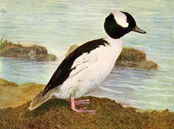 This small and wonderfully beautiful duck is a native of North America, wintering in the latitude of Cuba and Mexico and breeding from Maine to Montana and northward. It is said that a favorite place for its nesting is along the banks of the Yukon river, and other streams of the boreal regions, yet it is reported that the young have been captured in the Adirondack mountains. Though classed with the "sea ducks" (Fuligulinae) it is one of the most common of our fresh-water forms, and, like many other animals, as well as vegetable forms, of wide distribution, it is the recipient of numerous popular names, nearly all of them being more or less suggestive of its characteristics or habits. In the North it is frequently called the Butter-ball, the Butter-box, the Butter duck, the Spirit duck and the Dipper. In the South some of the same names are heard, but perhaps more often the Marionette, the Scotch dipper, or duck, the Scotch teal and the Wool-head. However, no more appropriate name could be selected than that of Buffle-head, having reference to the showy, ruffled or puffed plumage of the head. The technical name, albeola, meaning whitish, was given this species by Linnaeus in 1758, on account of the pure white on the side of the head.