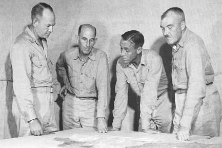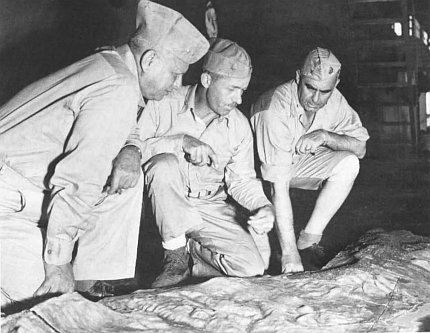 BGen Lemuel C. Shepherd, Jr., Commanding General, 1st Provisional Marine Brigade and his principal officers, from left, Col John T. Walker, brigade chief of staff; LtCol Alan Shapley, commander, 4th Marines; and Col Merlin T. Schneider, commander, 22d Marines, view a relief map of Guam for the brigade’s operation.