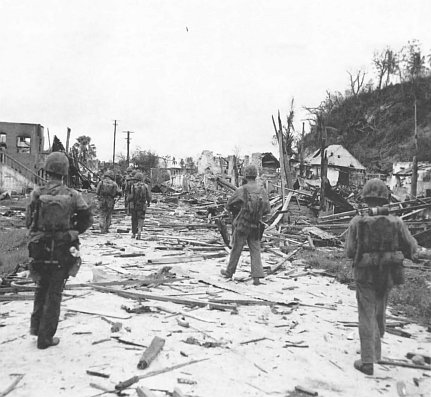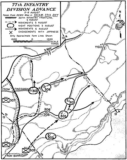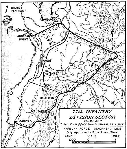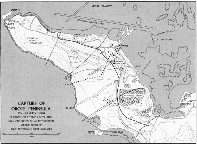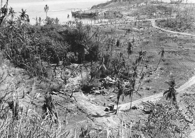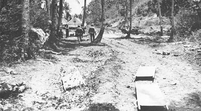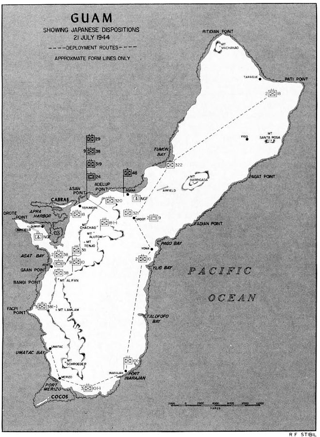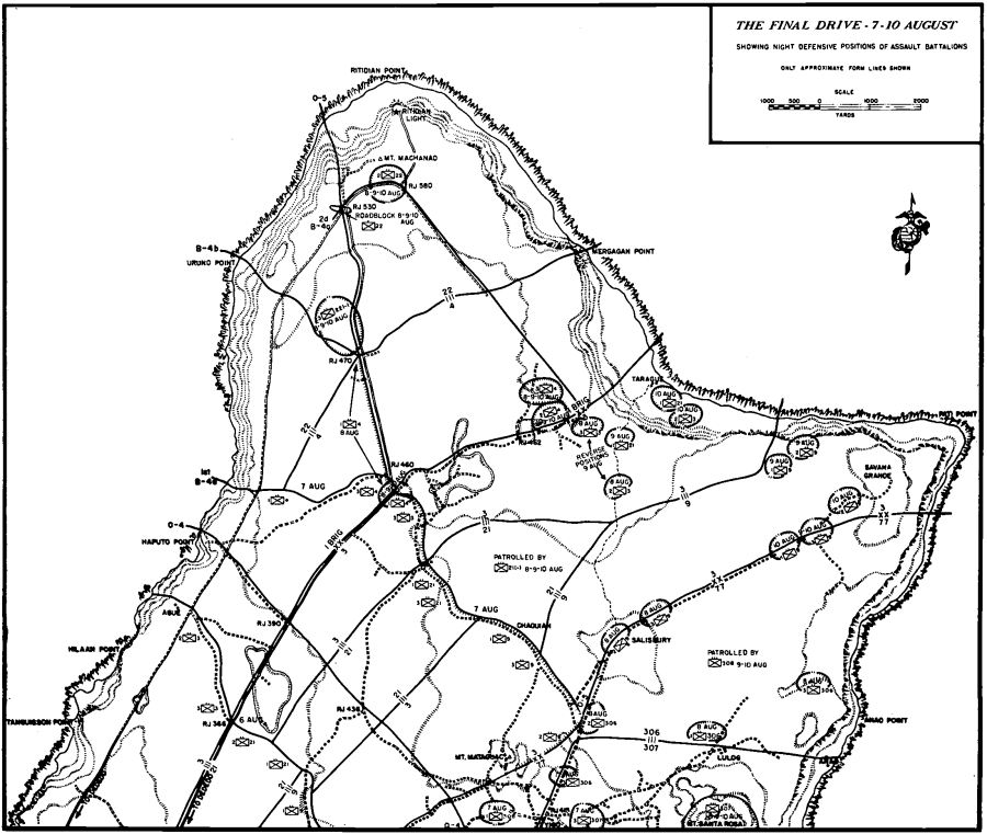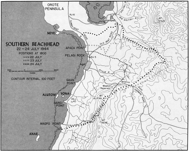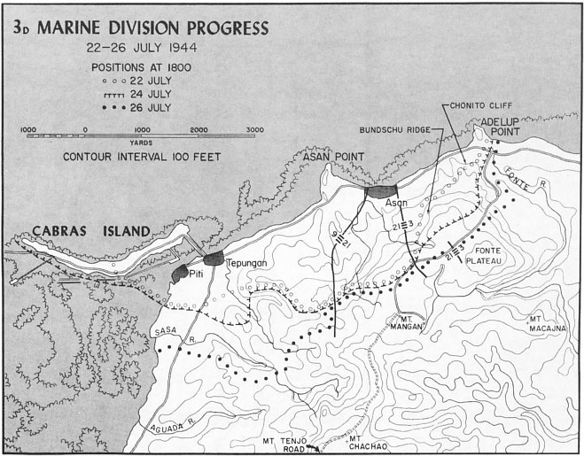 The 3d Battalion, 9th Marines, under Lieutenant Colonel Walter Asmuth, Jr., caught intense fire from the front and right flank near Asan Point, and he had to call on tanks for assistance, but one company got to9 the ridge ahead quite rapidly and threw the defenders at Asan Point off balance, making the regiment’s advance easier. (It would also be up to the 9th Marines to take Cabras, a little island offshore and hard against Apra Harbor. This would be accomplished with a separate amphibious landing.) With its 2d and 3d Battalions in the lead, the 9th Marines drove through its initial objectives quickly and had to slacken its advance in order not to thin out the division’s lines.
