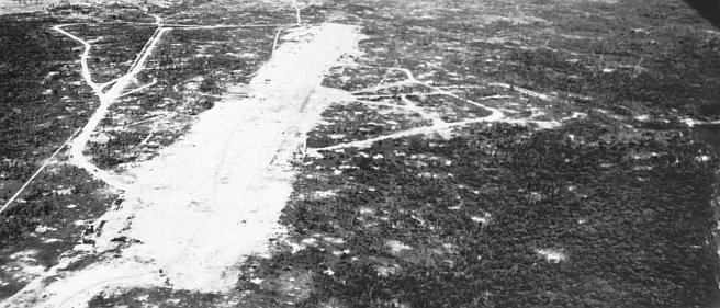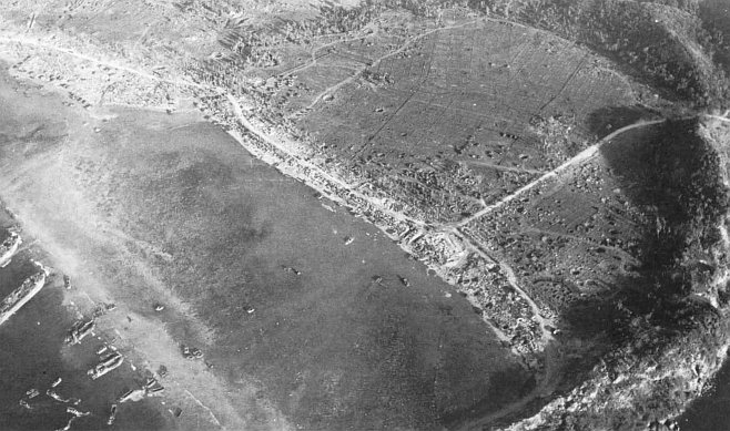 In the crowded, stifling well decks of the LSTs, the liberators climbed on board the LVTs and waited claustrophobic until the LST bow doors dropped and the tracked landing vehicles rattled out over these ramps into the swell of the sea. As the amphibian tractors circled (about 0615) near the line of departure, a flight of attack aircraft from the Wasp drowned out the whine of the amtrac engines and whirled up clouds of fire and dust, obscuring the landing beaches ahead. Eighty-five fighters, 65 bombers, and 53 torpedo planes executed a grass-cutting strafing and bombing sweep along all of the landing beaches from above the2 northern beaches of Agana, south for 14 miles to Bangi Point.