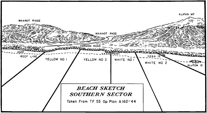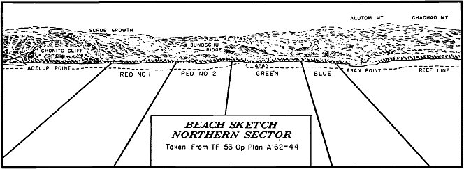 Troops of the 3d Marine Division landed virtually in the lap of the Japanese island commander, General Takashina, whose U-shaped cave command post, carved out of a sandstone cliff, overlooked the Asan-Adelup beachhead. The looming heights dominated the beaches, particularly on the left and center, where the 3d and 21st Marines were headed for the shore.