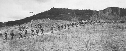 Company A, 3d Marines, is in a perilous position on W-Day plus 1, 22 July, as it is held up on Bundschu Ridge on its way to Chonito Ridge at the top. The troops were halted by Japanese fire, which prevented immediate reinforcement.