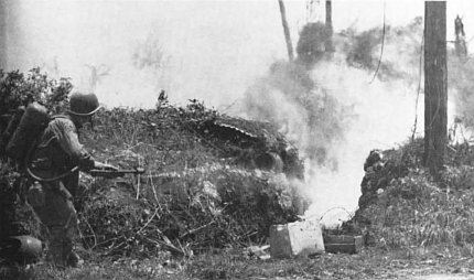 When the Marines landed, they found an excellent but undermanned Japanese trench system on the beaches, and while the pre-landing bombardment had driven enemy defenders back into their holes, they nonetheless were able to pour heavy machine gun and mortar fire down on the invaders. Pre-landing planning called for the Marine amtracs to drive 1,000 yards inland before discharging their embarked Marines, but this tactic failed because of a heavily mined beachhead, with its antitank ditches and other obstacles. However, the brigade attack ashore was so heavy, with overwhelming force the Marines were able to break through, and by 1034, the assault forces were 1,000 yards inland, and the 4th Marines’ reserve battalion had landed. After receiving extremely heavy fire from all emplaced Japanese forces, the Marines worked on cleaning out bypassed bunkers together with the now-landed tanks. By 1330, the Gaan Point blockhouse had been eliminated by taking the position from the rear and blasting the surprised enemy gunners before they could offer effective resistance. At this time also, the brigade command group was on the beach and General Shepherd had opened his command post.