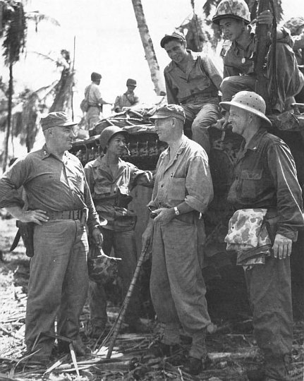 RAdm Richard L. Conolly, Southern Attack Force commander for the Guam landings, confers on Guadalcanal with the commanders of the Northern Attack Group during rehearsals prior to the departure for the Marianas target. From left to right: BGen Alfred H. Noble, assistant division commander, 3d Marine Division; Cdr Patrick Buchanan, USN, commander, Northern Transport Group; Adm Conolly; MajGen Allen Turnage, commanding general, 3d Marine Division.