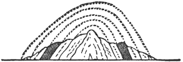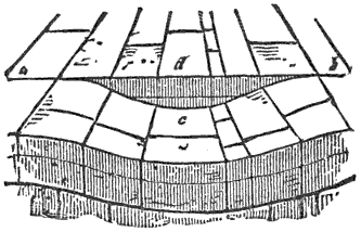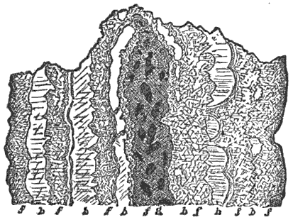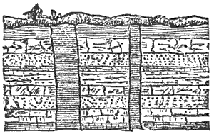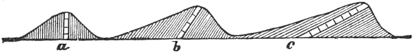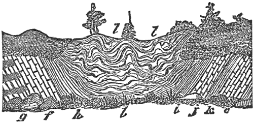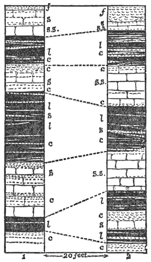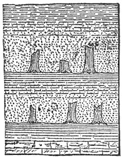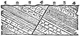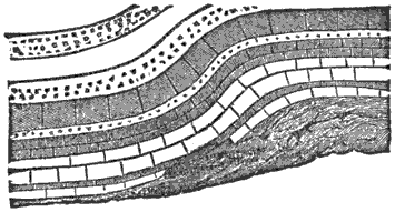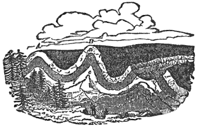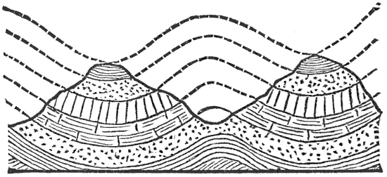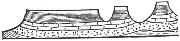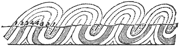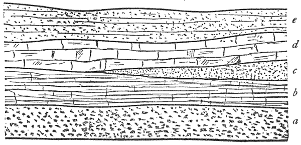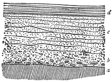 Mechanical Deposition.—Next let us notice what becomes of all this vast amount of clay, sand, and gravel after it is washed into the ocean. By taking up a glass of turbid water from our roadside rill, and observing that as soon as the water is undisturbed the sand and clay begin to settle, we learn that the solid matter is held in suspension by the motion of the water. But it does not remain in suspension long after being washed into the sea, for otherwise the sea would, in the course of time, become turbid for long distances from shore; and it is a well-known fact that the sea-water is usually clear and free from sensible turbidity close along shore and even near the mouths of large rivers, while at a distance of only 50 or 100 miles we find the transparency of the central ocean.