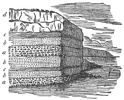 Behind our gravel-beach, or at its end, we have usually a cliff of rocks. As we approach this it is distinctly observable that the angular pebbles are more numerous, larger, and more angular; and a little observation shows that these are simply the blocks produced by jointing, and that the cliff is entirely composed of them. In other words, our cliff is a mass of natural masonry, which chemical agencies, the frost, and the sea are gradually disintegrating and removing. As soon as the blocks are brought within reach of the surf their mutual collisions make them rounder and smaller; and small round pebbles, sand, and clay are the final result.
