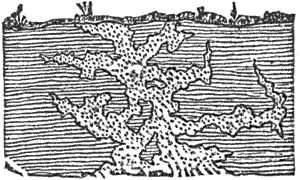 The caverns which are so large and numerous in most limestone countries are a splendid example of the solvent action of meteoric waters, being formed entirely by the dissolving out of the limestone by the water circulating through the joint cracks. The process must go on with extreme slowness at first, when the joints are narrow, and more rapidly as they are widened and more water is admitted. We get some idea, too, of the magnitude of the results accomplished by these silent and unobtrusive agencies when we reflect that almost all the loose earth and soil covering the solid rocks are simply the insoluble residue which carbon dioxide and water cannot remove. In low latitudes, where a warm climate accelerates the decay of the rocks, the soil is usually from 50 to 300 feet deep.