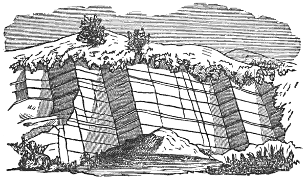 We can only allude in passing to the very important geological action of water in the solid state, as in glaciers and icebergs. The moisture precipitated from the atmosphere, and falling as rain, makes ordinary rivers; but falling in the form of snow in cold regions, where more snow falls than is melted, the excess accumulates and is gradually compacted to ice, which, like water, yields to the enormous pressure of its own mass and flows toward lower levels. When the ice-river reaches the sea it breaks off in huge blocks, which float away as icebergs. Moving ice, like moving water, is a powerful agent of erosion; and the glacial marks or scratches observable upon the ledges everywhere in the Northern States and Canada attest the magnitude of the ice-action at a comparatively recent period.