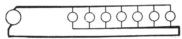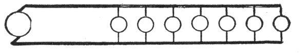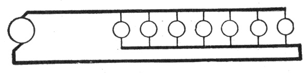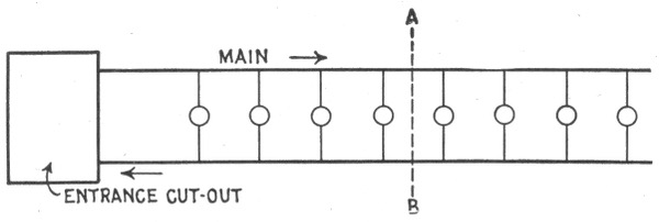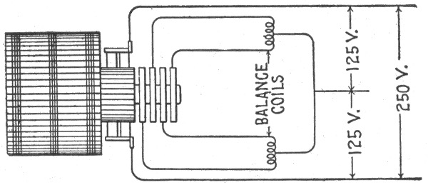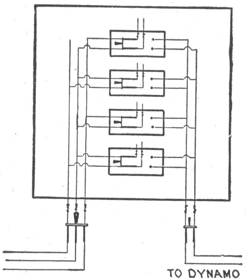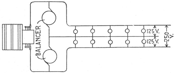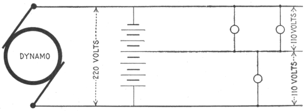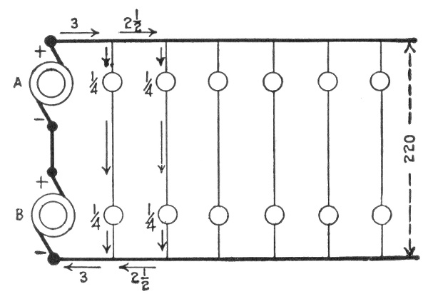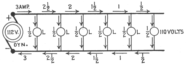 The general principle of the parallel system is shown in fig. 784. With six lamps on the circuit, each requiring one-half ampere of current, at 110 volts, the dynamo will have to supply a current of 3 amperes at a pressure of 112 volts, and this current will flow through the circuit and distribute itself as shown on account of the lesser resistance of the wire relatively to that of the lamps. At the first lamp, the 3 amperes will divide, ½ ampere flowing through the lamp and the remaining 2½ amperes passing on to the next lamp and so on through the entire circuit. The reduction of pressure from 112 volts across the brushes to 110 volts at the last lamp is due to the resistance of the conducting wires.