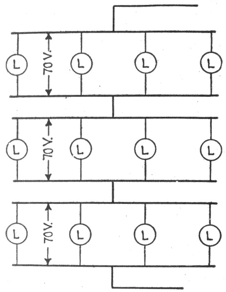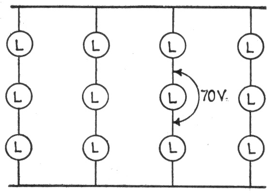 Ans. Since the total voltage of the system is equal to the sum of the volts consumed in all of the lamps, it is high enough to be dangerous to personal safety. 699