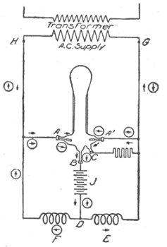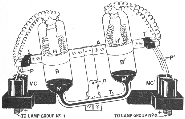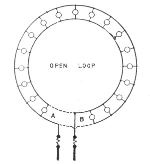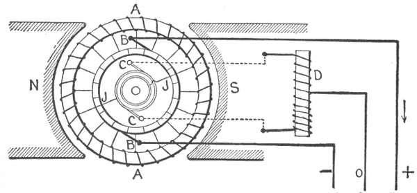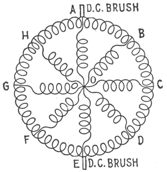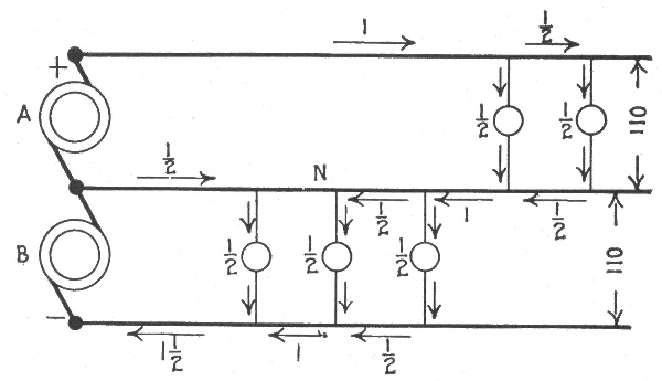 For example. Each open arc lamp requires about 50 volts. In the system shown in fig. 783, the pressure measured across the brushes of the dynamo is assumed to be 1,000 volts. As this current flows through the circuit 45 volts will be actually lost in each lamp, and as the drop on the line wire is usually about 10 per cent. of the total voltage, there will be a drop of 5 volts on the conductor between any two lamps. In the circuit shown, there are twenty lamps, therefore, the difference in pressure between either terminal of the dynamo and middle point A of the circuit will be 10 lamps × 50 volts = 500 volts. Likewise, the difference in pressure between any two points on the circuit will be equal to 50 volts multiplied by the number of lamps included between them.