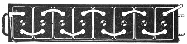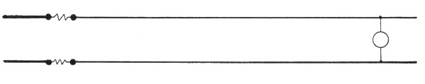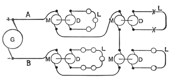 Series System of Distribution.—A series system affords the simplest arrangement of lamps, motors, or other devices supplied with electric energy. The connections of such a system 698 are shown in fig. 783. The current from the terminal of the dynamo passes through the lamps, L, L, L, L, one after the other and finally returns to the terminal. The current remains practically constant, but the voltage falls throughout the circuit in direct proportion to the resistance, and the difference in pressure between any two points in the circuit is equal to the current in amperes multiplied by the resistance in ohms included between them.