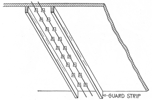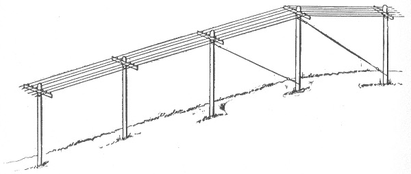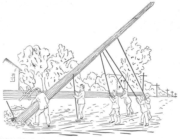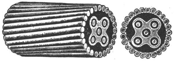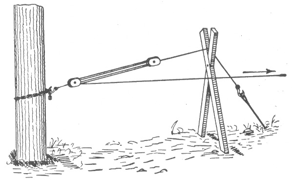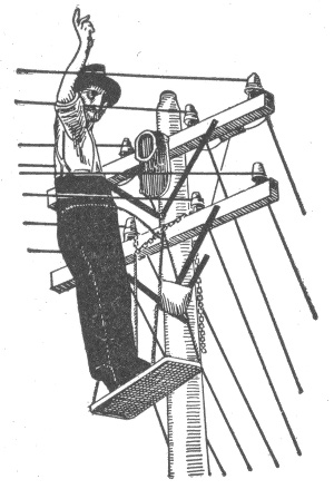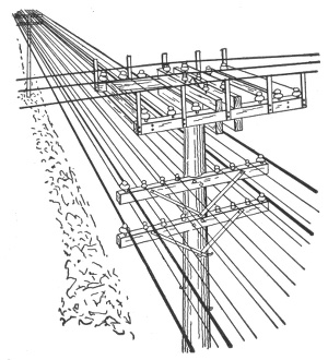 Materials for outside conductors—tensile strength of copper wire—pole lines—pole constructing tools—wooden poles—preservation of wooden poles—preservation processes—methods of setting wooden poles in unsuitable soil—reinforced concrete poles—cross arms—lineman's portable platform—poles for light and power wires—spacing of poles—erecting v the poles—guy anchors—method of raising a pole—method of pulling anchor into place—guys for poles—head and foot guying—guying corner poles—guy stubs and anchor logs—climbers—wiring the line—pay out reels—method of stringing wires—"come alongs"—tension on wires—sag table—lineman's block and fall with "come alongs"—attaching wire to insulator—splicing; American wire joint; McIntire sleeve and sleeve joint—transpositions—insulators—overhead cable construction—petticoat insulator—Clark's "antihum"—service connections and loops—method of making series, and parallel service connections—joint pole crossing—service wires.