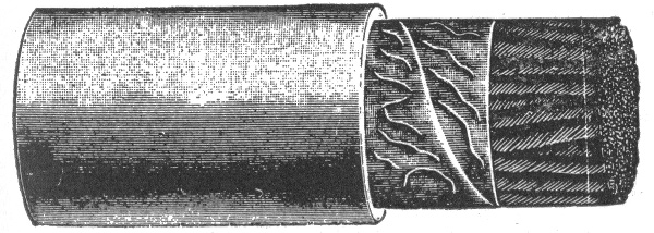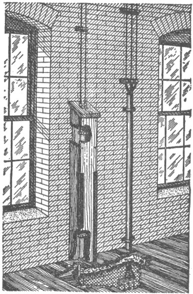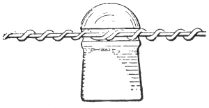 This is illustrated in fig. 783. If the line be grounded at B owing to defective insulation, the pressure of the circuit at that point will be zero, and therefore, a man standing on the ground could touch that point without receiving a shock, but if he should touch the line at the point C, he will receive a slight shock of 150 volts, as there are three lamps between the point C, and the ground connection B. Therefore, the danger of touching the circuit increases directly with the resistance between the point touched and the ground connection, so that if a man touch the circuit at the point D, he will receive a dangerous shock of 16 × 50 = 800 volts. In practice, sixty lamps are often placed on a single arc lighting circuit, so that its total pressure is about 3,000 volts, thus greatly increasing the danger of the system.