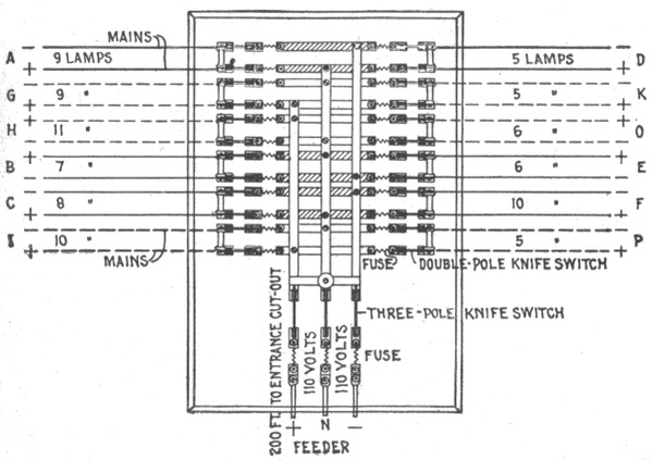 Preliminary considerations—various wires—copper wire—iron wire—German silver wire—standard of copper wire resistance—relative conductivity of different metals and alloys—conductors—cable for elevator annunciators—covered conductors—rubber covered conductors—rubber insulated telephone and telegraph wires—weather proof conductors—twisted weather proof wires—precautions in using weather proof conductors—slow burning wire; where used—slow burning weather proof wire; where used; how installed—miscellaneous insulated conductors—safe carrying capacity of wire—pothead wires—circular mils—square mils—mil foot—lamp foot—ampere foot—center of distribution—wire gauges—B. & S. standard wire gauge—micrometer screw gauge—calculating gauge—table of various wire gauges—table of lamp feet for iv rubber covered wires—lamp table for weather proof wires—symmetrical and unsymmetrical distribution—wiring table for light and power circuits—table of wire equivalents; how to use—table of cable capacities—incandescent lamps on 660 watt circuits—"tree" and "modified tree" system of wiring—distribution with sub-feeders—wrong and right methods of loop wiring—table, of amperes per motor; of amperes per dynamo—calculations for three wire circuit—three wire circuit panel board—size of the neutral wire.