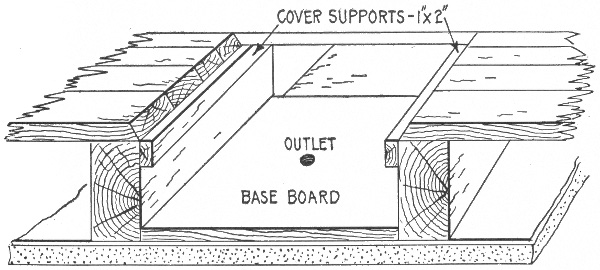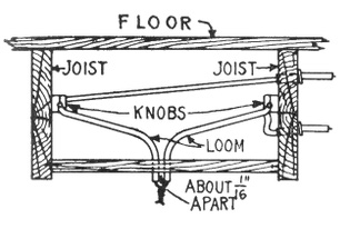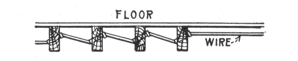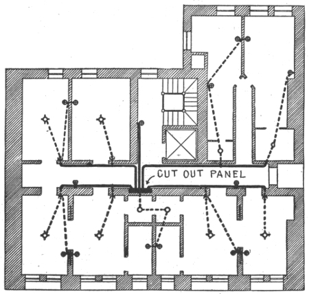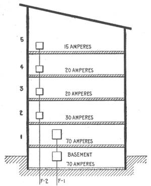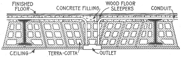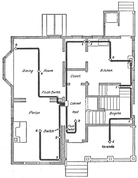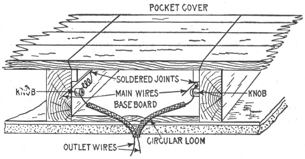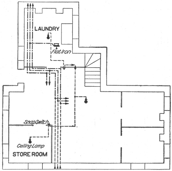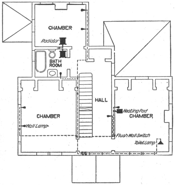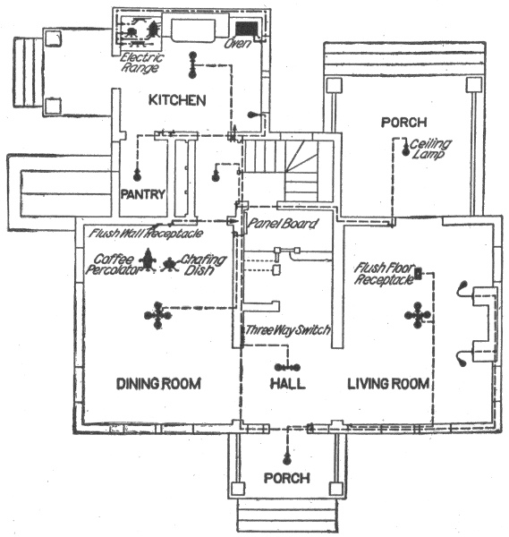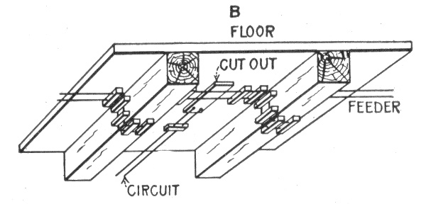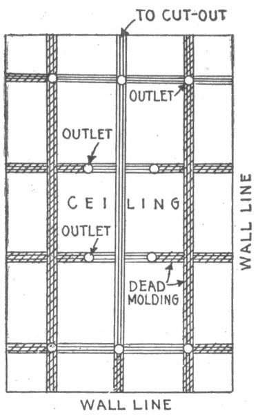 Preliminary considerations—electrician's instructions—location of receptacles—ceiling buttons—hallway wiring—selection of wiring system—three wire convertible system—method of wiring—location of panel boards—current required on each floor of building—arrangement of feeders—installation of motors—largest size of feeder permissible—method of cutting pocket in floor—outlet baseboard—completed pocket—how to examine partition interiors—house plan of conduit wiring—attachment of mains to knobs—precautions in making joints—wiring for heating appliances—wiring with combination of moulding, flexible tubing or conduit in non-fire proof building—feeder system for large hotel.