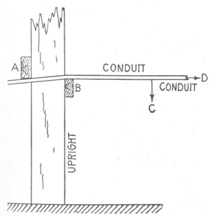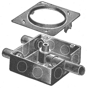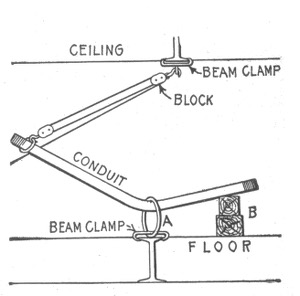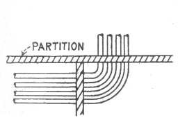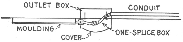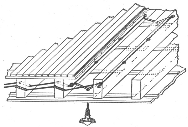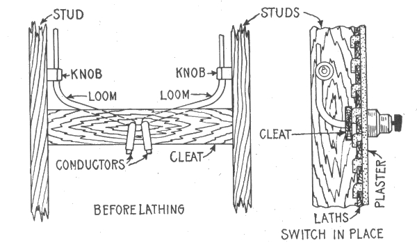 The term "wiring"—open or exposed wiring—selection of wires—installation—disadvantages of open wiring—splicing—pitch of wires—crossing of wires—wiring across pipes—practical points relating to exposed wiring—methods of carrying wires, through floors; on walls—protecting exposed wiring on low ceilings—various porcelain knobs and cleats—wires used in mouldings—standard wooden moulding—kick box—usual character of moulding work—practical points relating to wiring in mouldings—tapping outlets—arc light wiring—arc lamps on low pressure service—circular fixture block—concealed knob and tube wiring; objections; method of installation—arrangement of switch and receptacle outlet in knob and tube wiring—switch boxes—rigid conduit wiring; advantage—types of rigid conduit; requirements—-conduit box—disadvantages of unlined conduit—flexible conduit wiring—Greenfield flexible steel conduit—"fishing"—insulating point—canopy insulator—fish plug and method of insertion—method of installing conduits in fireproof buildings—service entrance to rubber conduit system—condulet outlet to arc lamp—hickey—methods of bending large conduits—armoured cable wiring; features; installation.