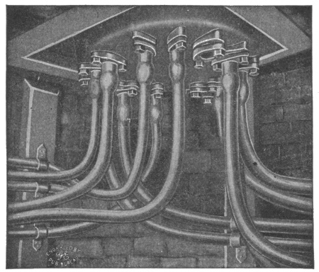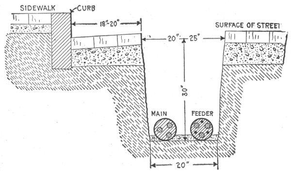 City conditions—underground systems—various conduits—vitrified clay pipe conduit—vitrified clay or earthenware trough conduit—joints in multiple-duct vitrified clay conduit—concrete duct conduits—methods of laying conduit—method of laying single duct vitrified clay conduit—method of laying multiple duct clay conduit—wooden duct conduits—objection to use of wood; remedy; adaptation wooden built-in conduits; method of installation—wrought iron or steel pipe conduits; method of installation—porcelain bridgework or carriers—cast iron pipe and trough conduit; advantages—fibre conduits; joints—Edison tube system—underground cables—metal sheaths on underground cables—pot heads—General Electric manhole junction box—pot head connections.