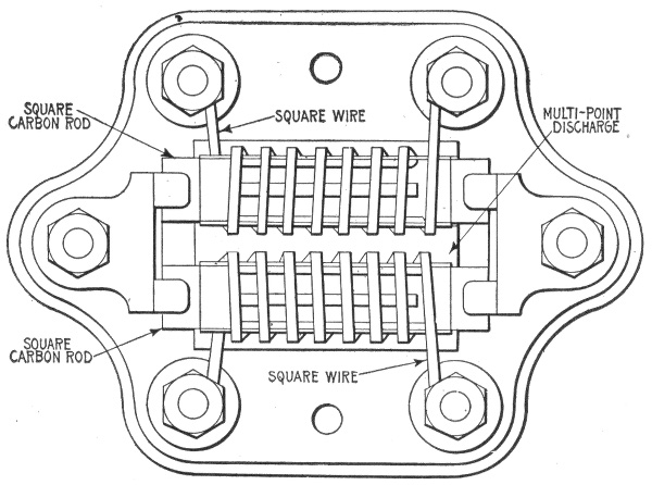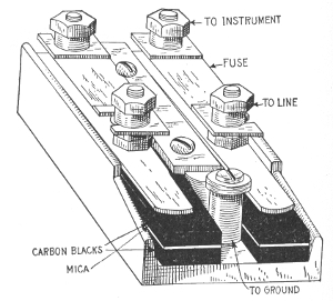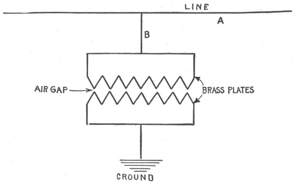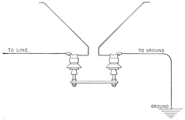 Lightning rods; why sharp points are used; erection—diagram showing principle of air gap arrestor—variable gap arc breaker—location of lightning arrestor—carbon arresters with fuses for telephone lines—ground connection.