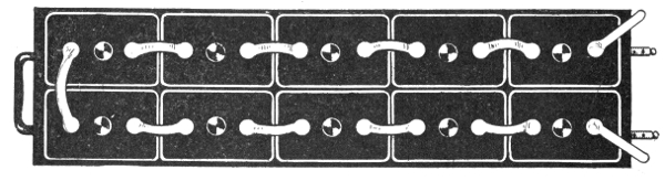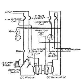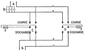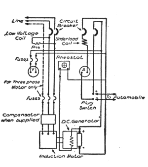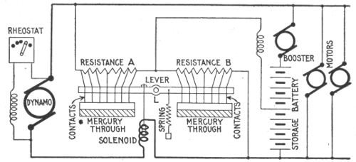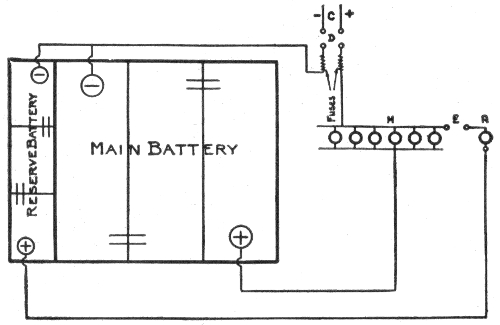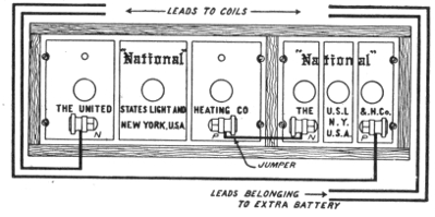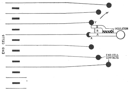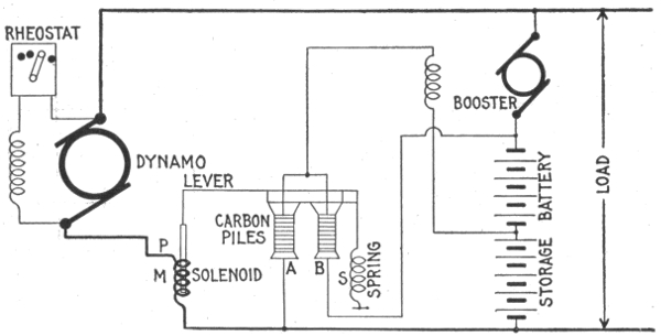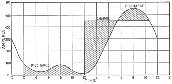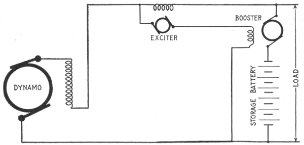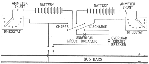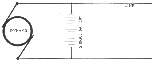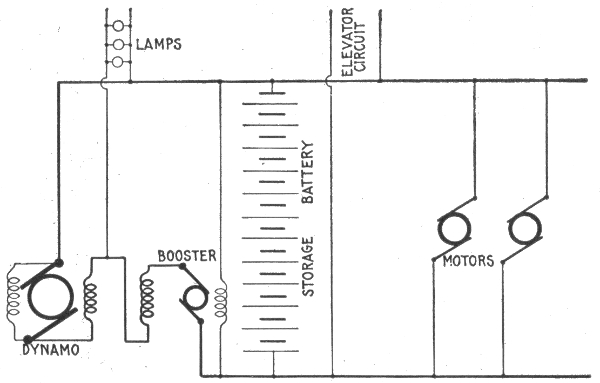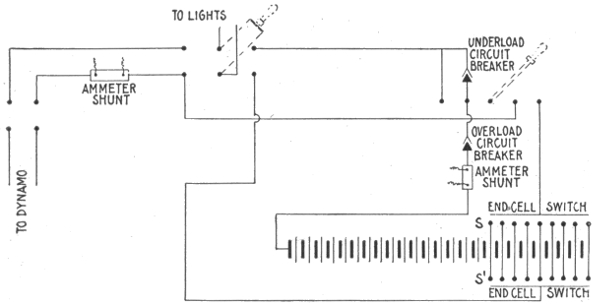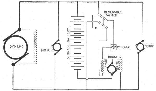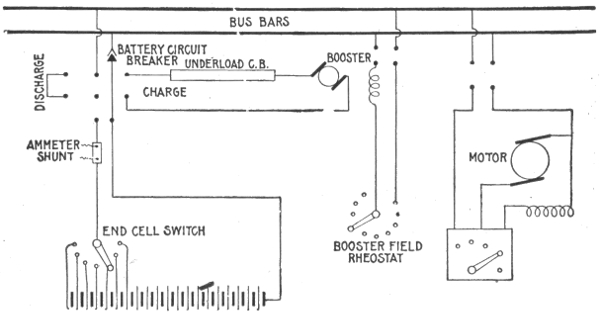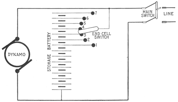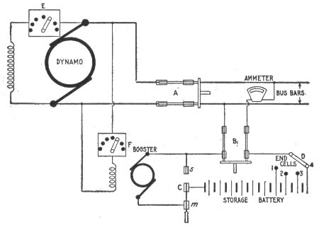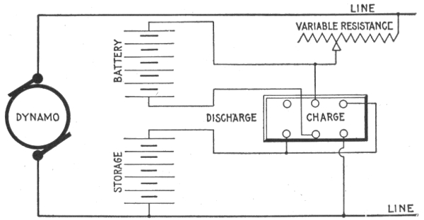 Uses of storage batteries; their importance in power plants—load curve showing use of storage battery as aid to the generating machinery—parallel connection of battery and dynamo—"floating the battery on the line"—diagram showing effect of battery in regulating dynamo load—connections and circuit control apparatus—diagram showing action of battery as a reservoir of reserve power—three wire system with battery and dynamo—methods of control for storage batteries—diagram of connections for ignition outfit—variable resistance—end cell switches—diagram of connection of battery equipment for residential lighting plant—end cell switch diagram—features of end cell switch construction—end cell switch control—circuit diagram for charging battery in two parallel groups and discharging in series—reverse pressure cells; regulation—Holzer-Cabot dynamotor—boosters—application viii of series booster system—Bijur's battery system—load diagram—characteristics of series booster—shunt boosters; with battery—Entz' carbon pile booster system—application of shunt booster—circuit diagram for non-reversible shunt booster and battery system—compound boosters; their connections—method of charging battery at one voltage and supplying lights at a different voltage—connections of one form of differential booster—differential boosters; with compensating coil; adaptation.