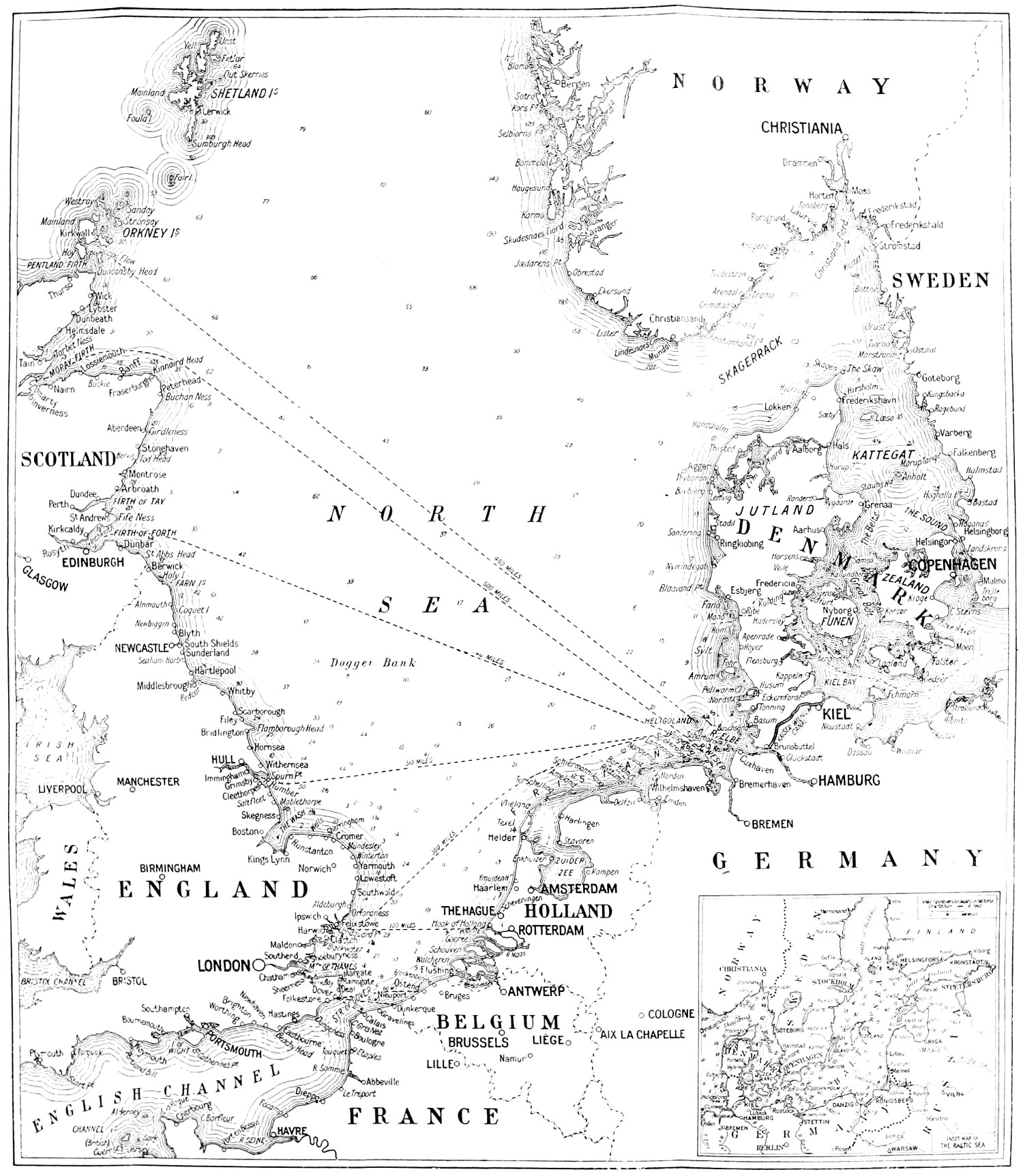 In the history of sea power, there is nothing comparable with the strangulation of German oversea shipping in all the seas of the world. It followed almost instantly on the declaration of war. There were over 2,000 German steamers, of nearly 5,000,000 tons gross, afloat when hostilities opened. The German sailing ships—mostly of small size—numbered 2,700. These vessels were distributed over the seas far and wide. Some—scores of them, in fact—were captured, others ran for neutral ports, the sailings of others were cancelled, and the heart of the German mercantile navy suddenly stopped beating. What must have been the feelings of Herr Ballin and the other pioneers as they contemplated the ruin, at least temporary ruin, of years of splendid enterprise? The strategical advantages enjoyed by England in a war against Germany, lying as she does like a bunker across Germany’s approach to the oversea world, had never been[12] understood by the mass of Germans, nor by their statesmen. Shipowners had some conception of what would happen, but even they did not anticipate that in less than a week the great engine of commercial activity oversea would be brought to a standstill.