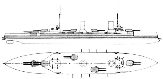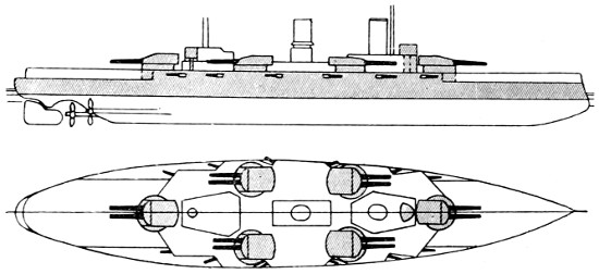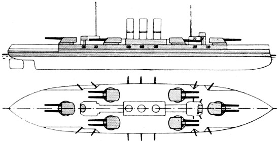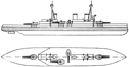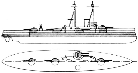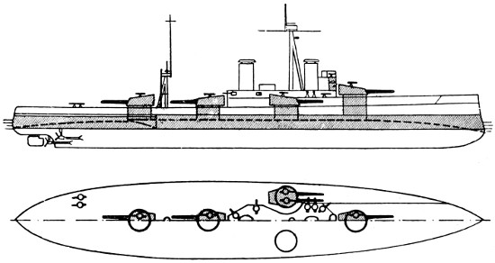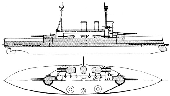Speed: 22 knots; Guns: 10 13·5in., 16 4in.; Torpedo tubes: 5.