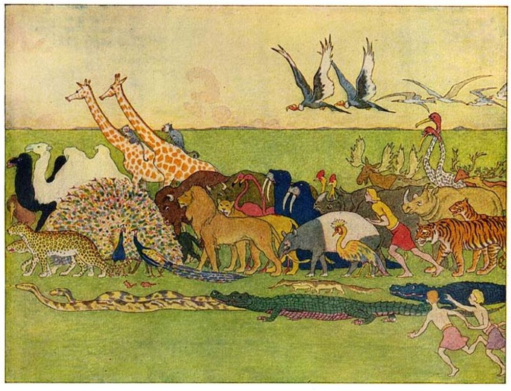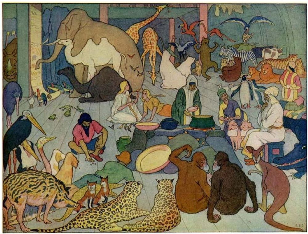 Then Noah went abroad and called together all the animals, by twos, and told them that they must come into the Ark to be saved from the deluge.