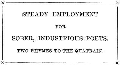 “Well, where do you find evidences of such careful editing in that hotch-potch which you describe so carefully?” I hear some carping critic ask, and as I run my eye over what I have written I realize that I have utterly failed in my attempt to convey an idea of the glories of that particular number of the Ledger. I would[Pg 8] say, however, to my critical friend that the paper is well edited because it does not contain a line of prose or a stanza of verse that is not aimed directly at the hearts and minds of the vast army of farmers, midwives, gas-fitters’ daughters, and the blood-relations of janitors who constituted its peculiar clientèle. And I would add that if the critical one desires to get at the very bone and sinew of Ledger literature he should make a careful study of the poems which were an important feature of it, and in which may be found the very essence of the great principles by which the paper was guided.