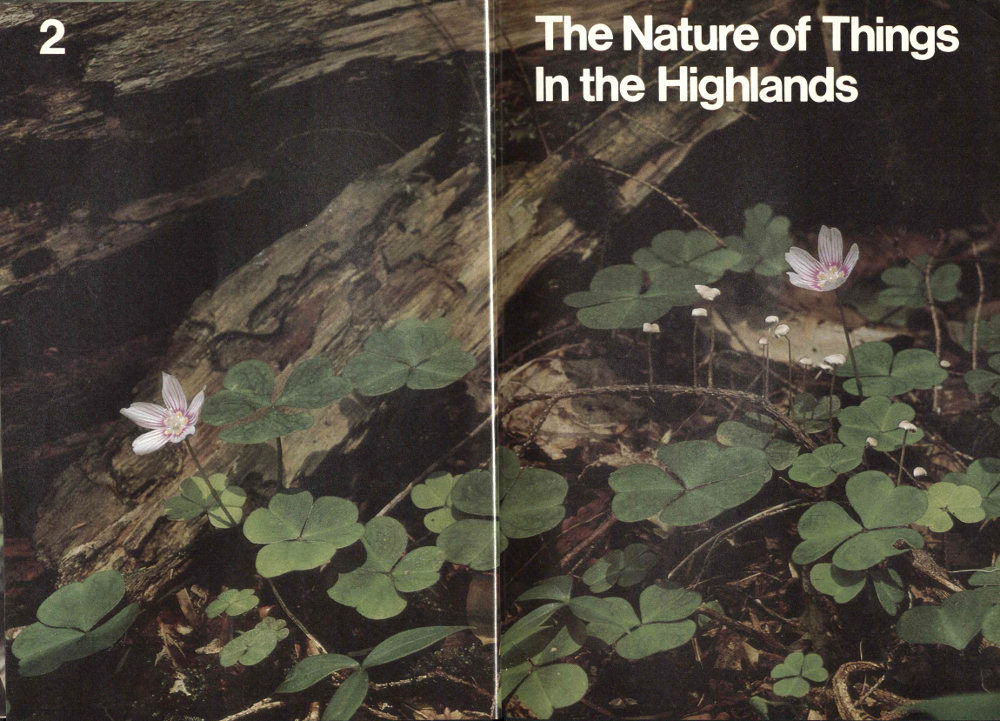 A short distance beyond, the trail breaks out onto the top of a cliff, opening to us the whole breadth of the mountains. This is our final reward; and as we sit here we see, without knowing it, a summary of our day’s experience. We see landslide scars on the mountainside that probably came during a storm like the one we just experienced, when the earth, heavy with water and lying thinly over the smooth rock beneath, could no longer hang on and slipped in a crashing avalanche down the slope; like the pine beetle, landslides are one of the many natural forces that challenge the forest’s powers of recuperation. Chimney swifts pick insects from the air and we hear the chatter of a red squirrel interrupted in its hunt for cones. Like the shrew, each in its own special way is busy gaining the fuel to stay alive. Each, through its interaction with plants and animals, affects the total fabric of Smokies life. Far below, the trees of a cove forest march up a stream valley; on the slopes above them spreads a mantle of oaks. A narrow ridge far down and off to the right bears the dark green of pines. Nearer, we see the ragged lower edge of the spruce-fir forest, where it fingers into the northern hardwoods below it. But we sense an overall unity because each kind of forest merges into the next, creating an unbroken mantle that lies over all the ridges as far as the eye can see.