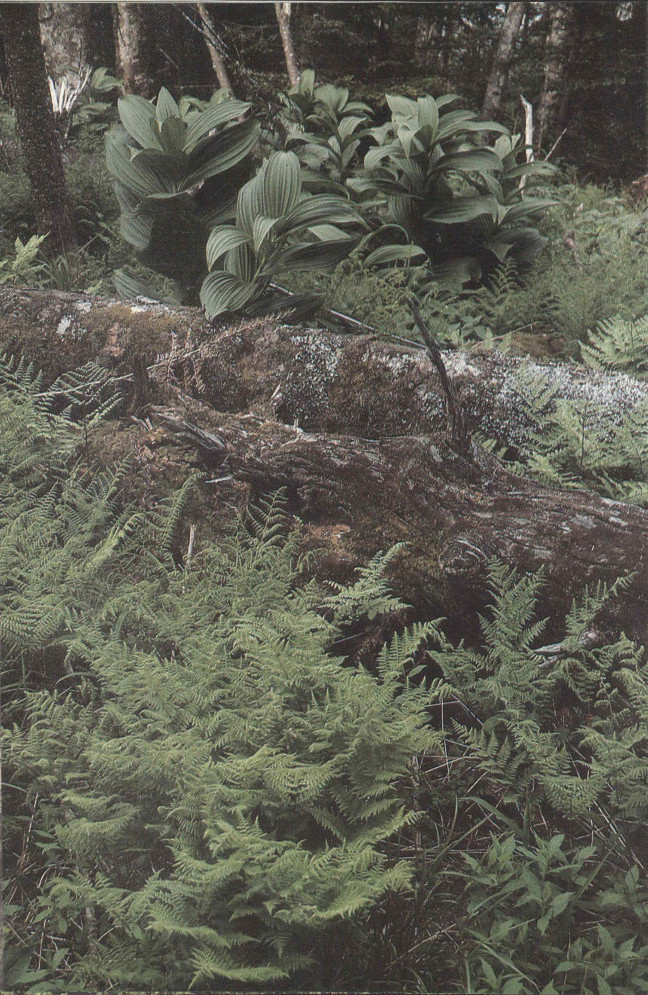 Around a bend the stream gradient steepens and so does the road. We are still in young forest; here it grows where cattle formerly grazed or lumbermen felled its giant ancestors. For some time we labor upwards, the road becoming a trail and a few big trees appearing along the tumbling creek. Then, rather suddenly, there is a striking difference in the environment. We have crossed the line into primeval forest, into territory where the axman has not been and most of the trees are big. This is Great Smokies virgin cove forest, a type unrivaled in the northern hemisphere for combined variety and size of trees. Here it is cool, shady, and moist. The tree trunks shoot high above into the canopy, which intercepts most 26 of the sunlight and seems to enclose us in a private world. The ground around us is covered with the greenery of small plants. We hear bird songs but cannot see the singers.